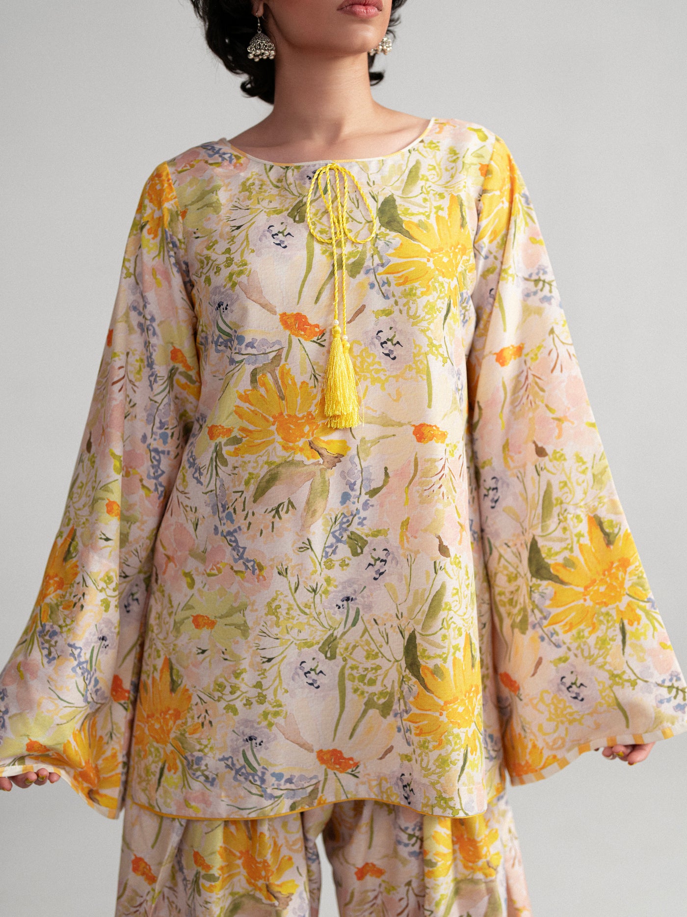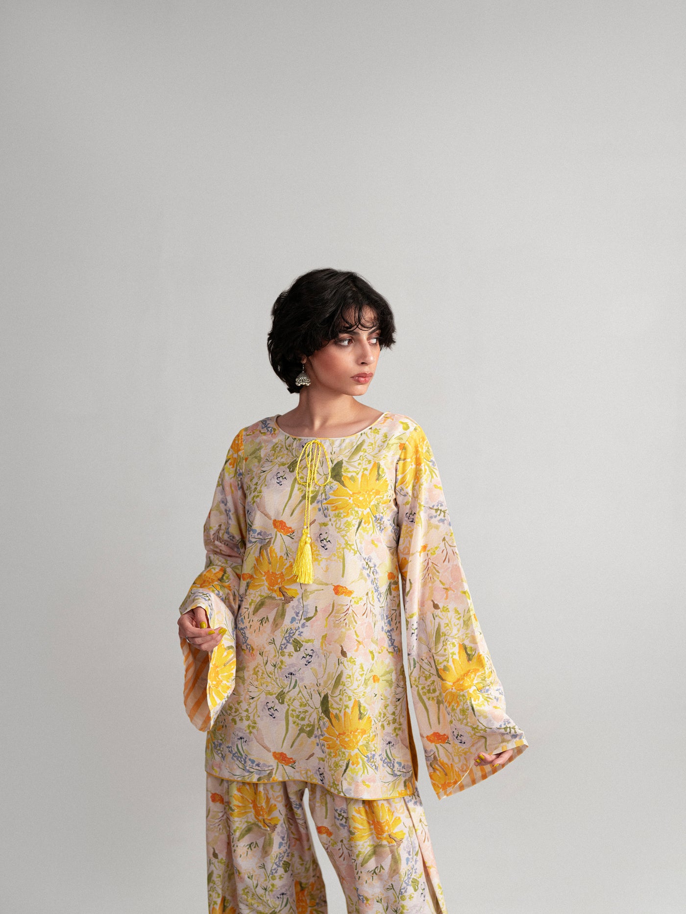 Short kameez paired with Farshi style shalwar.Handmade silk tassel details on neckline for a luxuriously chic look.Perfect for every day wear.