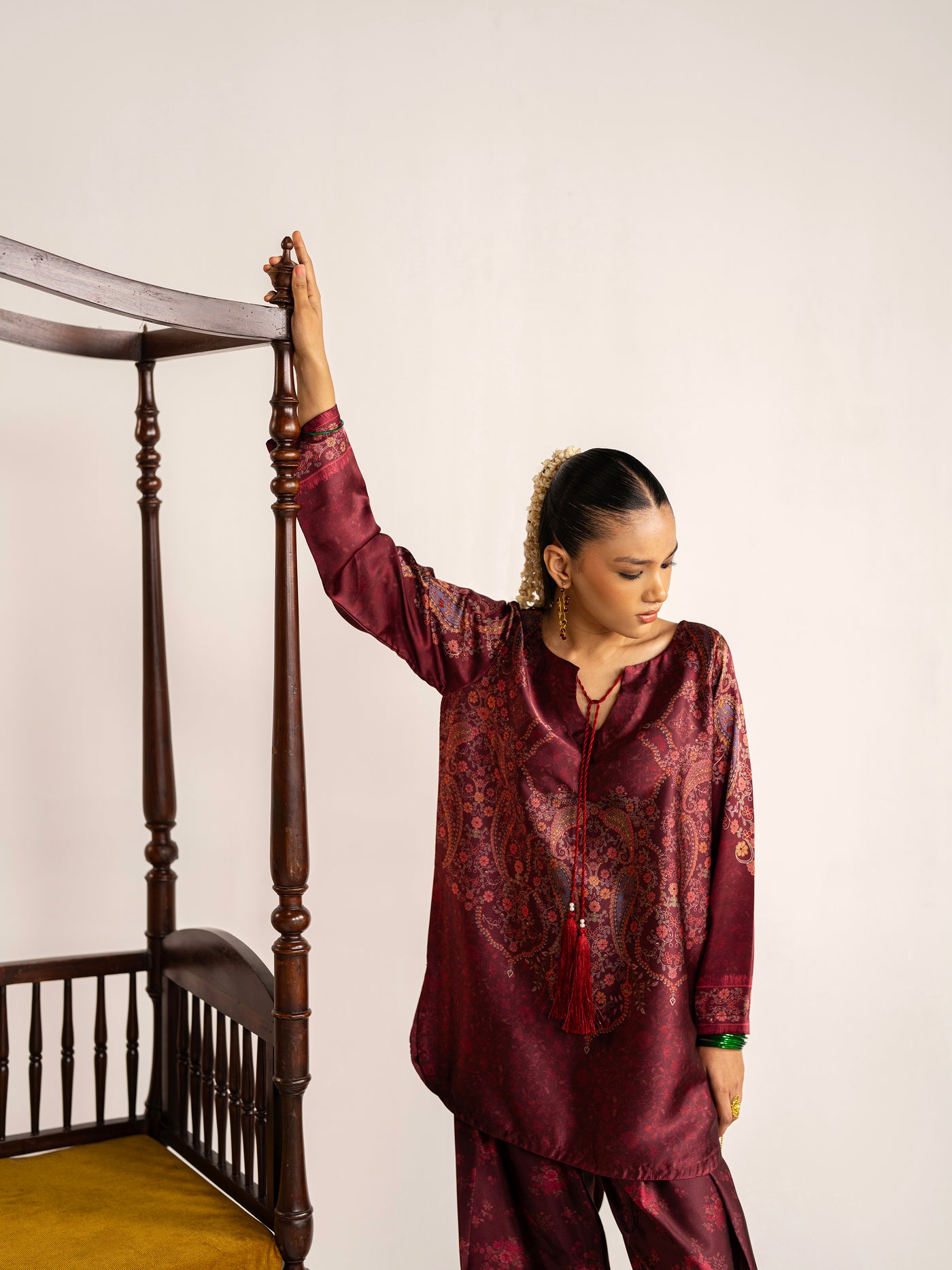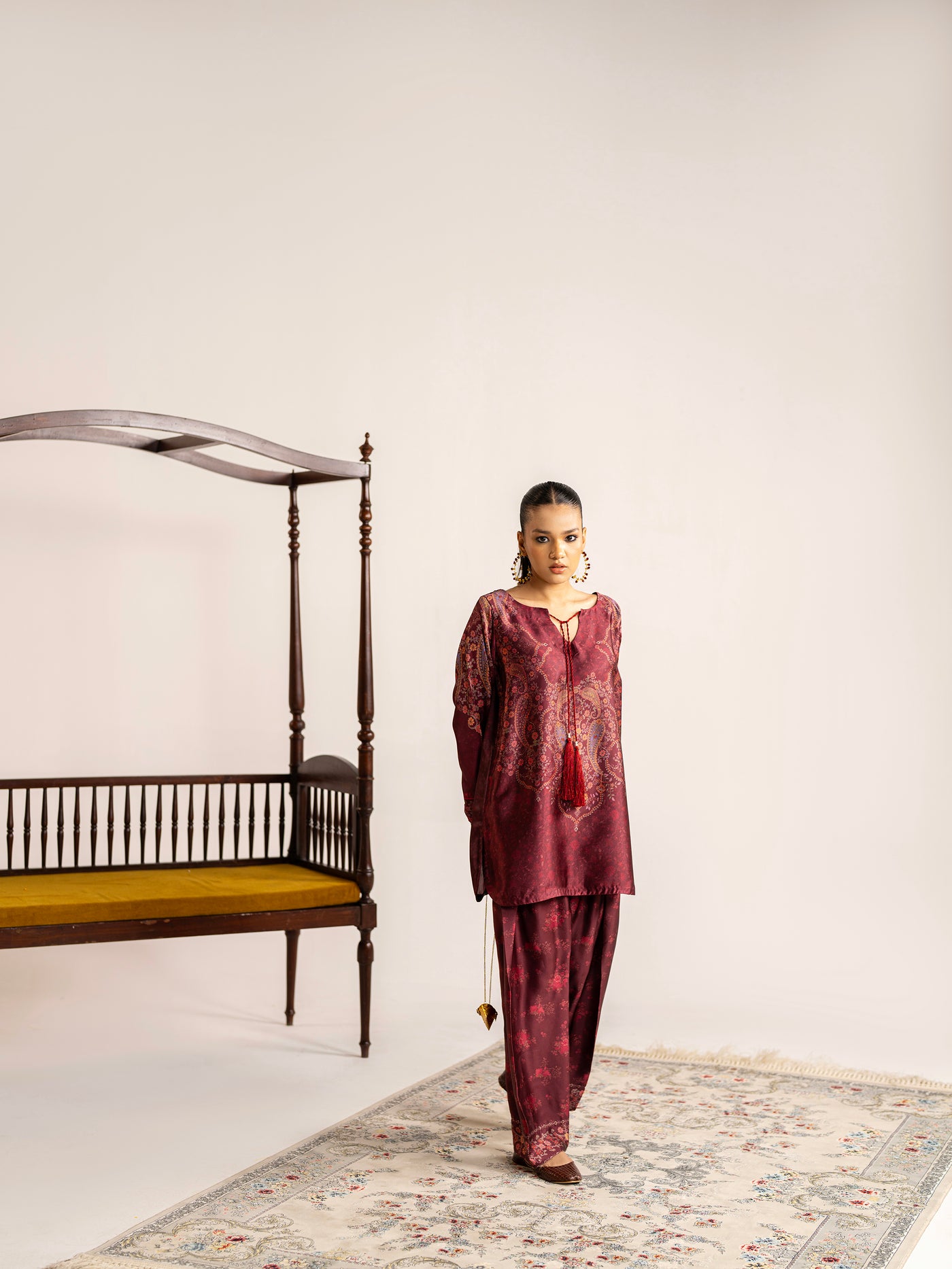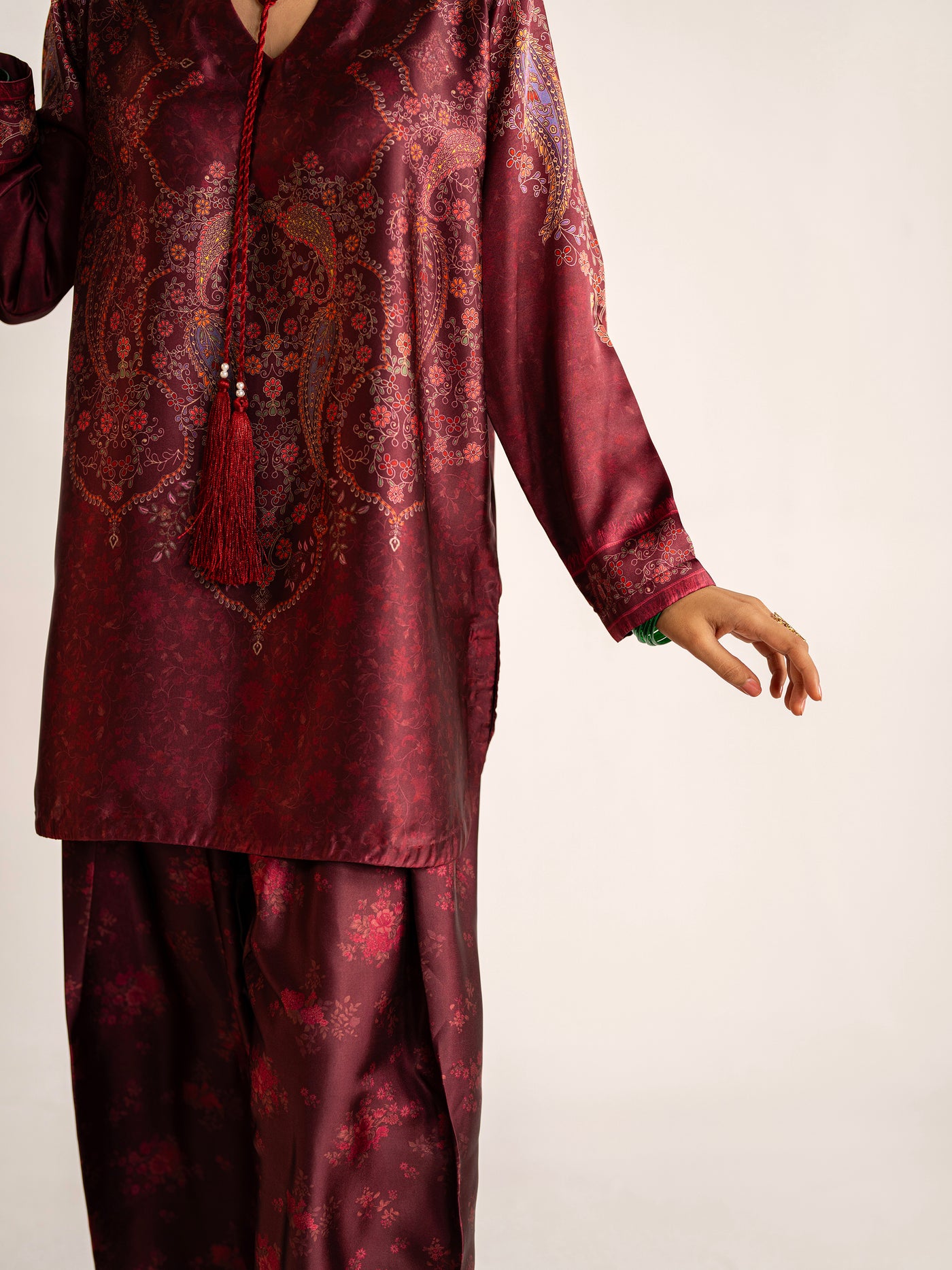 2-piece - Farshi Shalwar set in premium silk, featuring handmade resham tassels and metal coin details around the neckline - a blend of elegance and tradition.