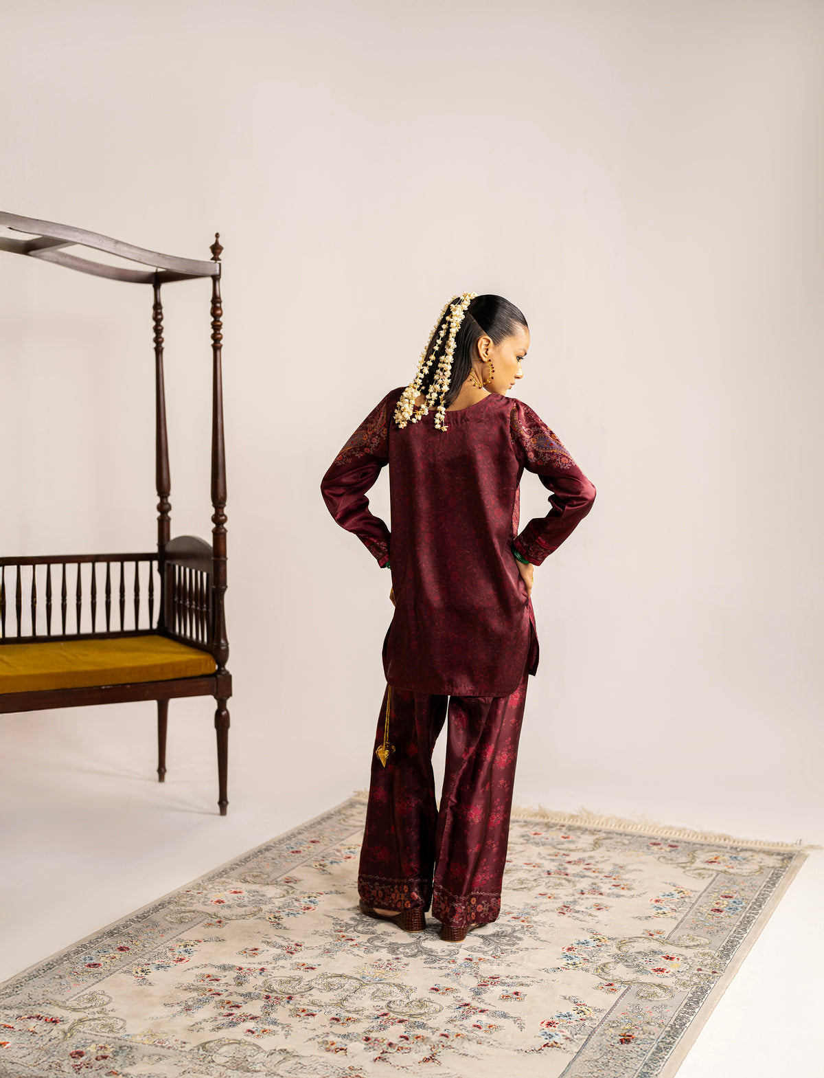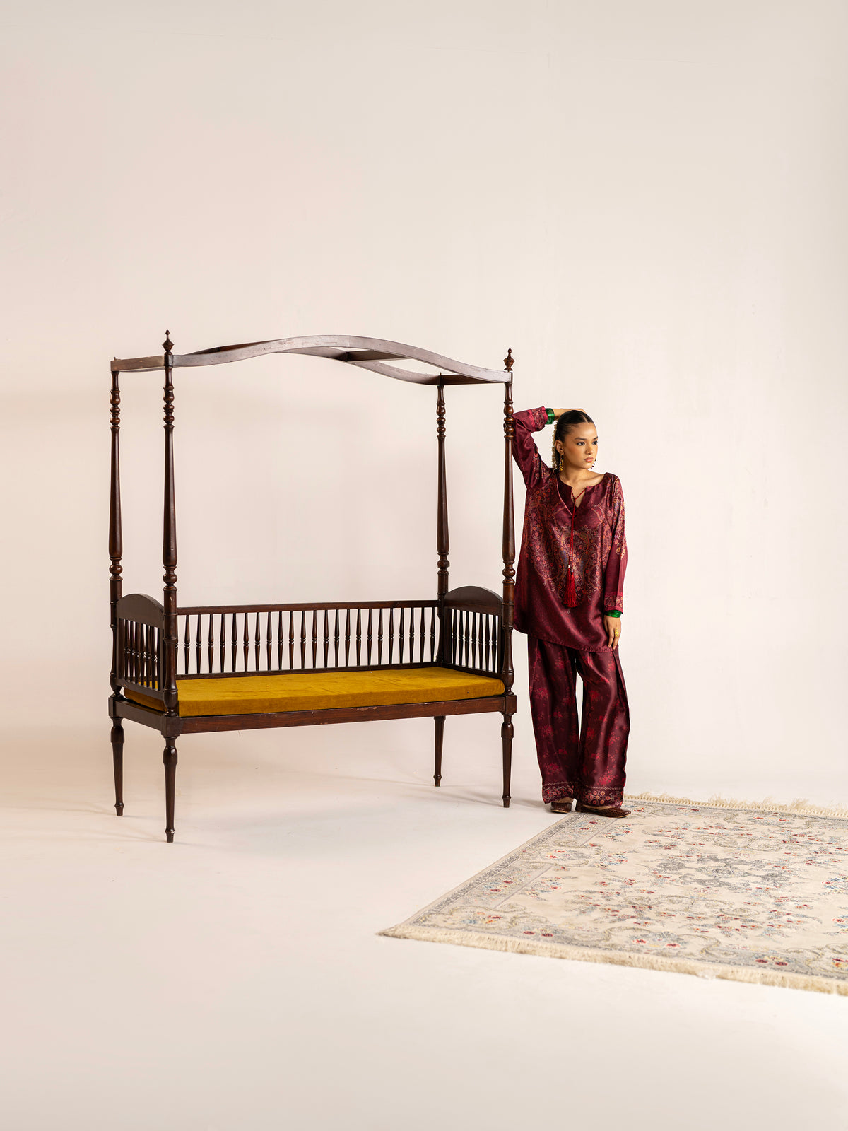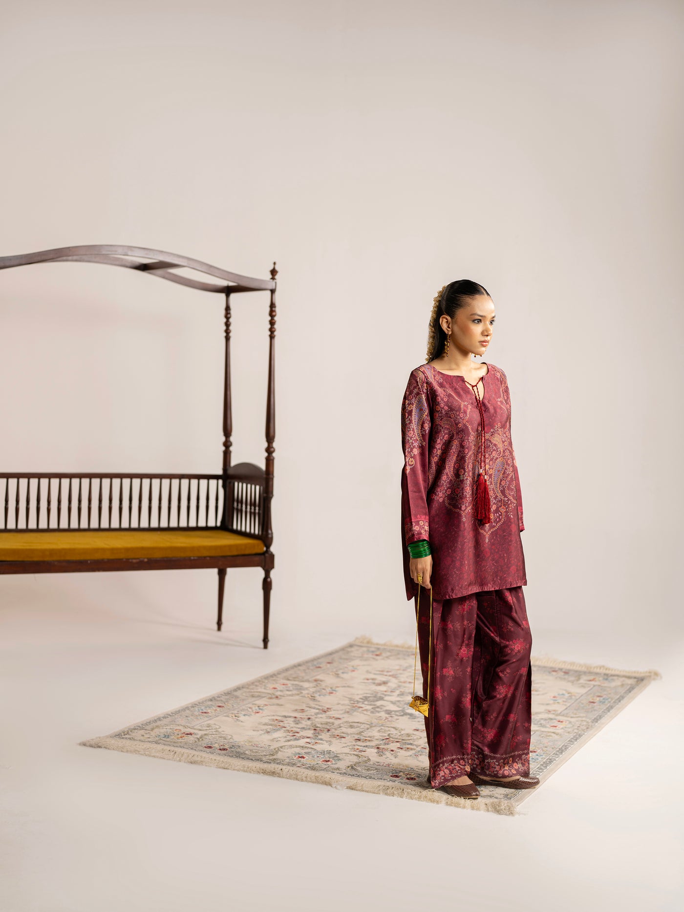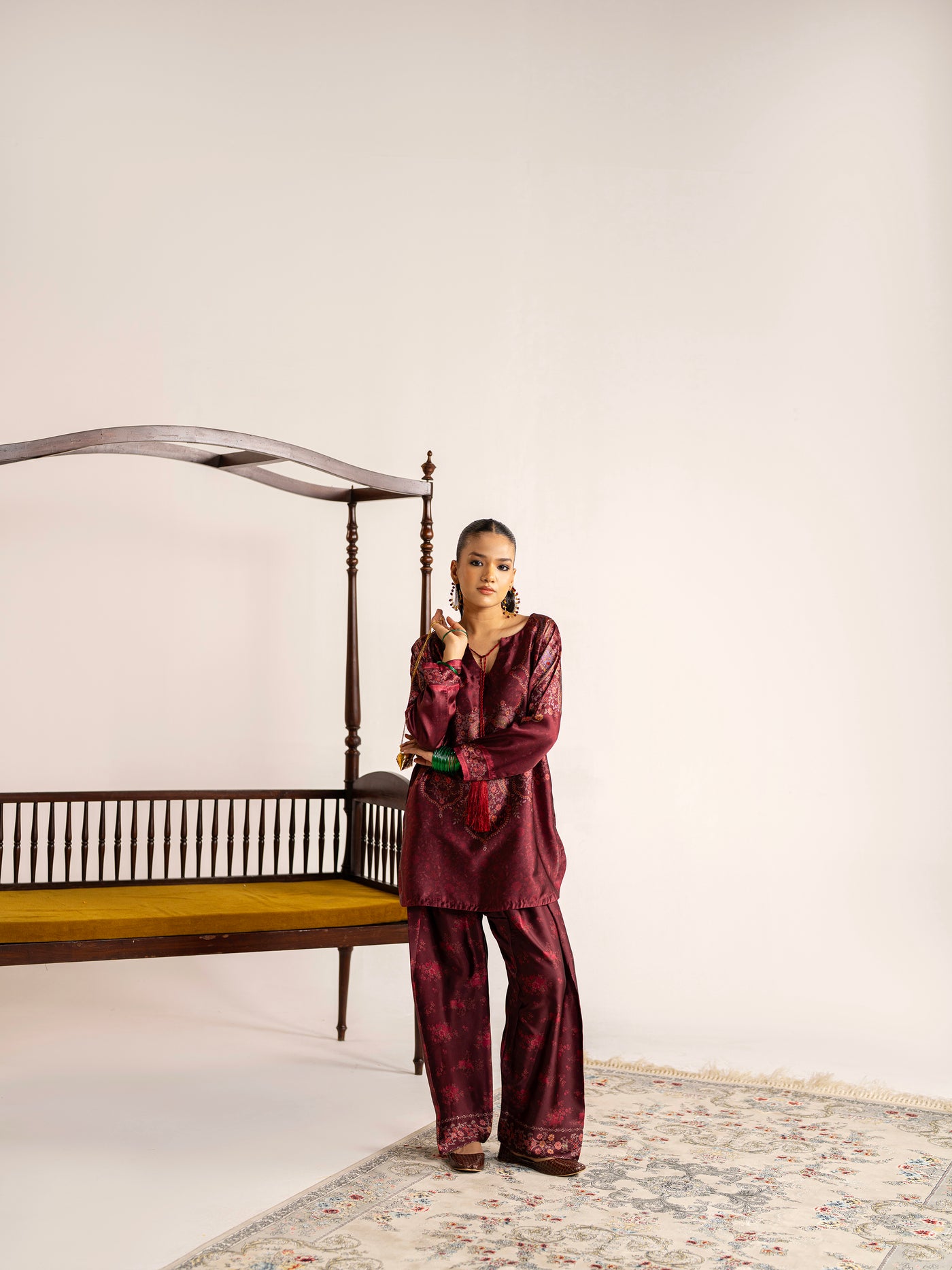 2-piece - Farshi Shalwar set in premium silk, featuring handmade resham tassels and metal coin details around the neckline - a blend of elegance and tradition.