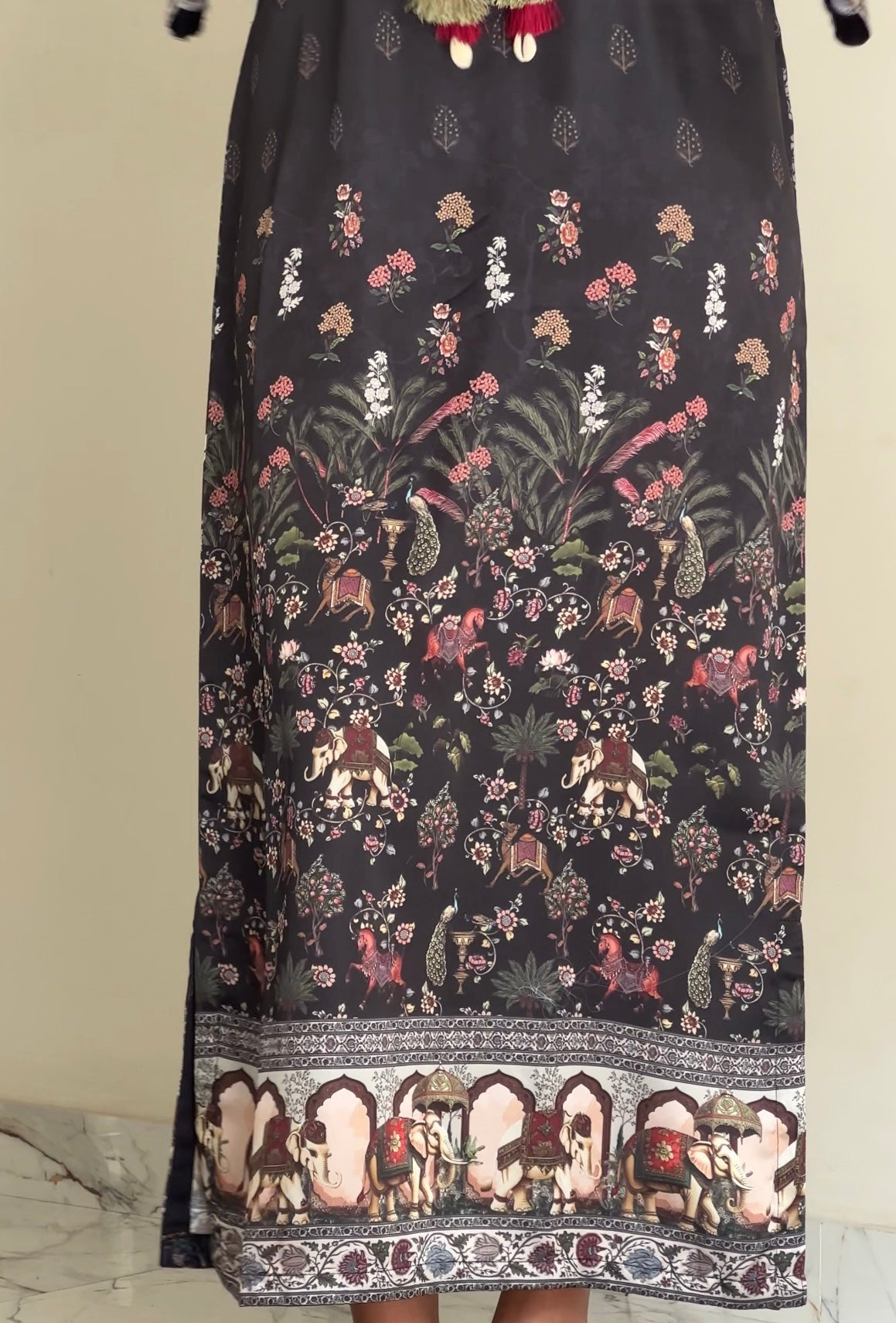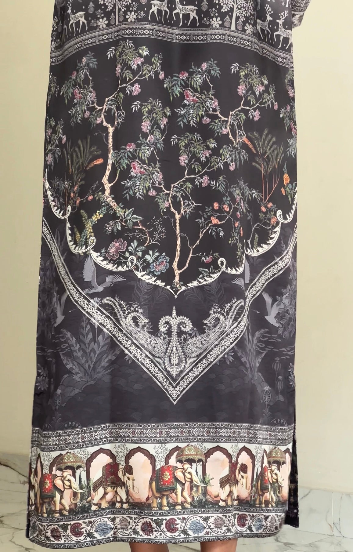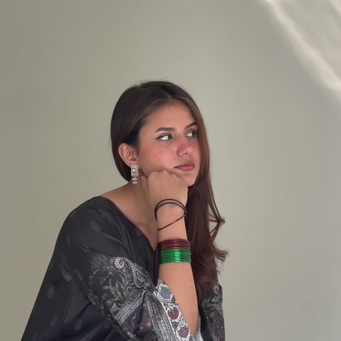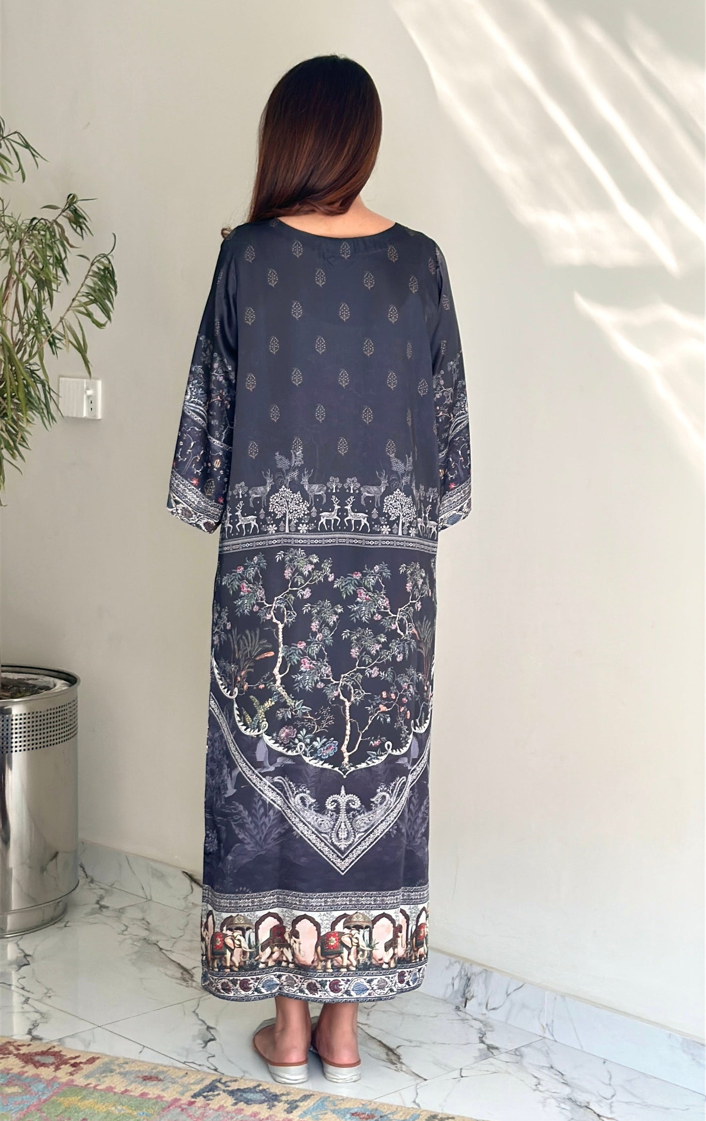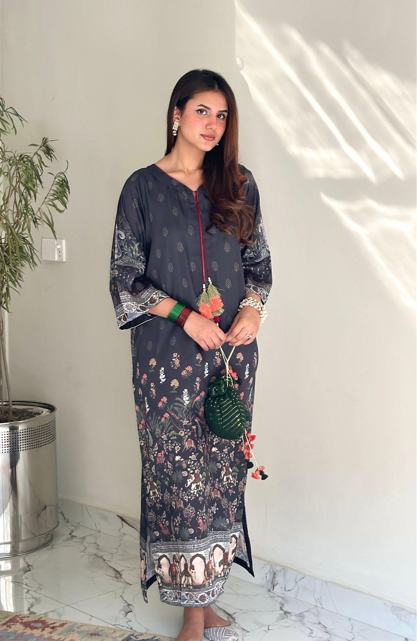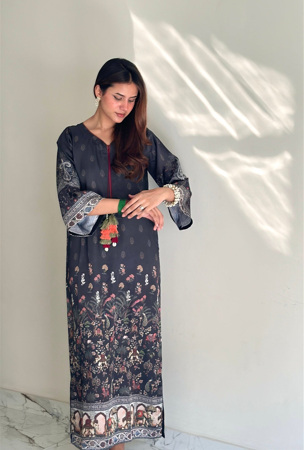 A one-piece long kaftan-style shirt featuring premium silk borders on the hem and sleeves, finished with handmade resham tassels on the neckline for a graceful festive touch.