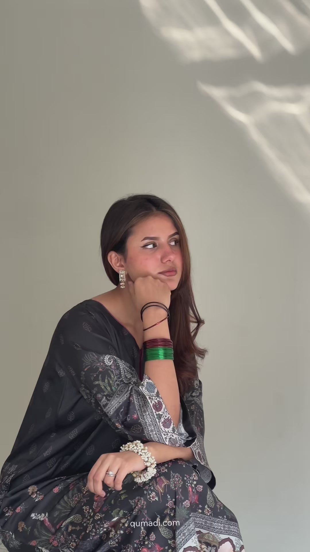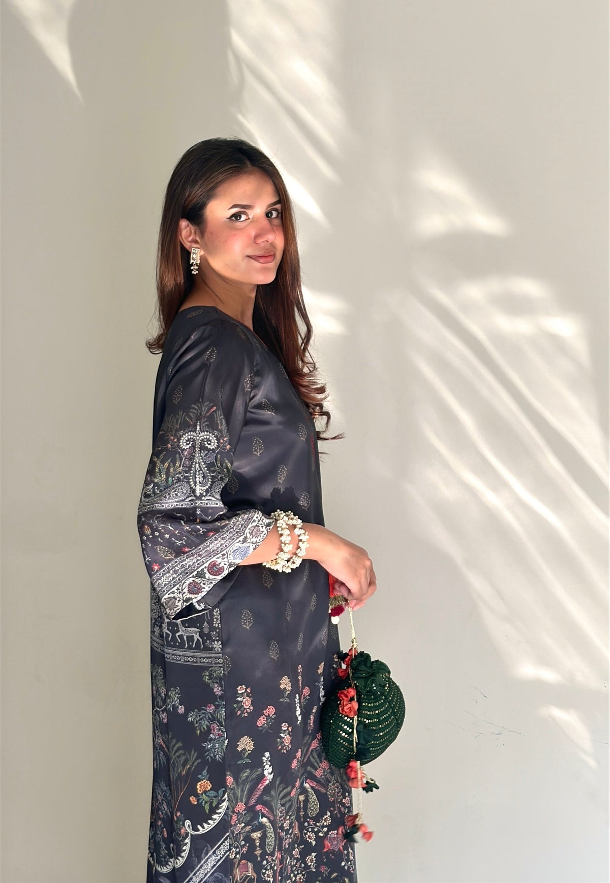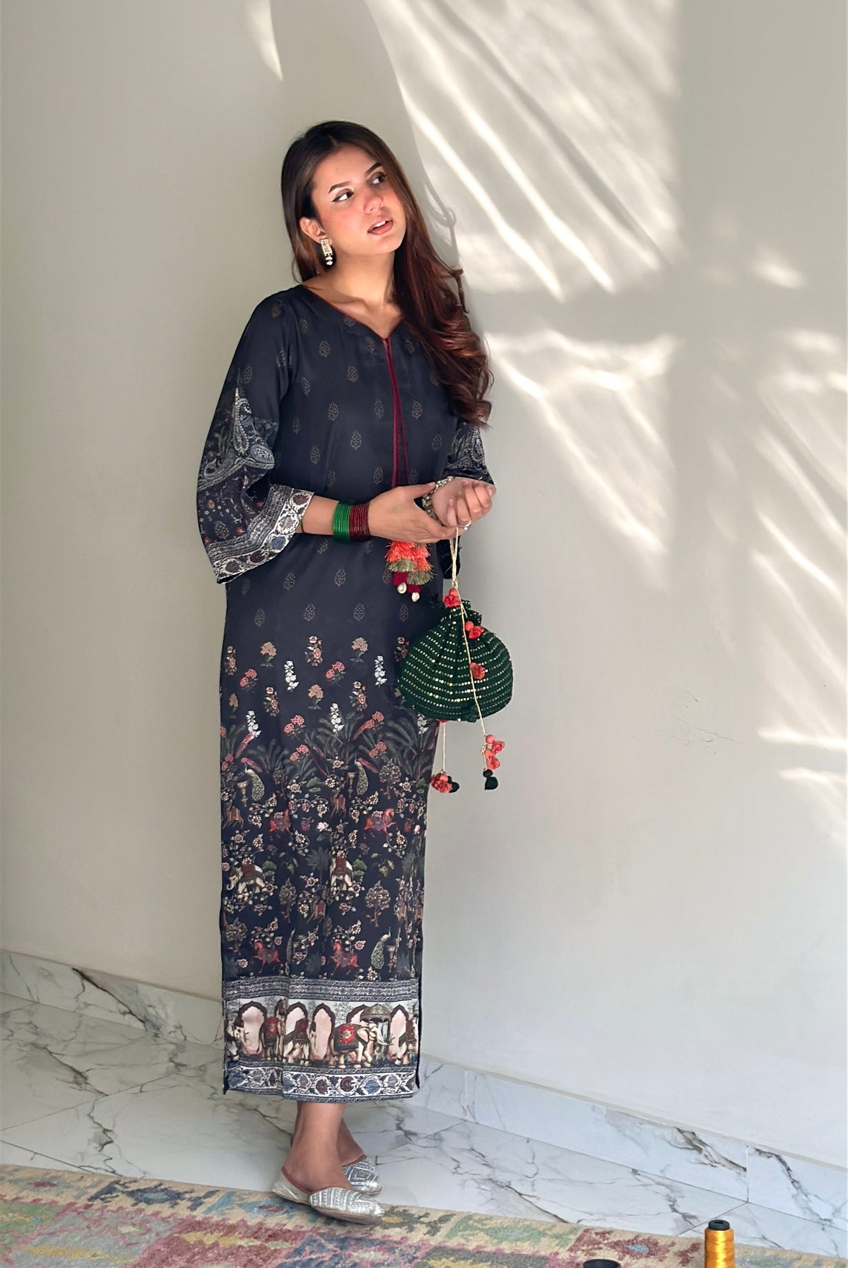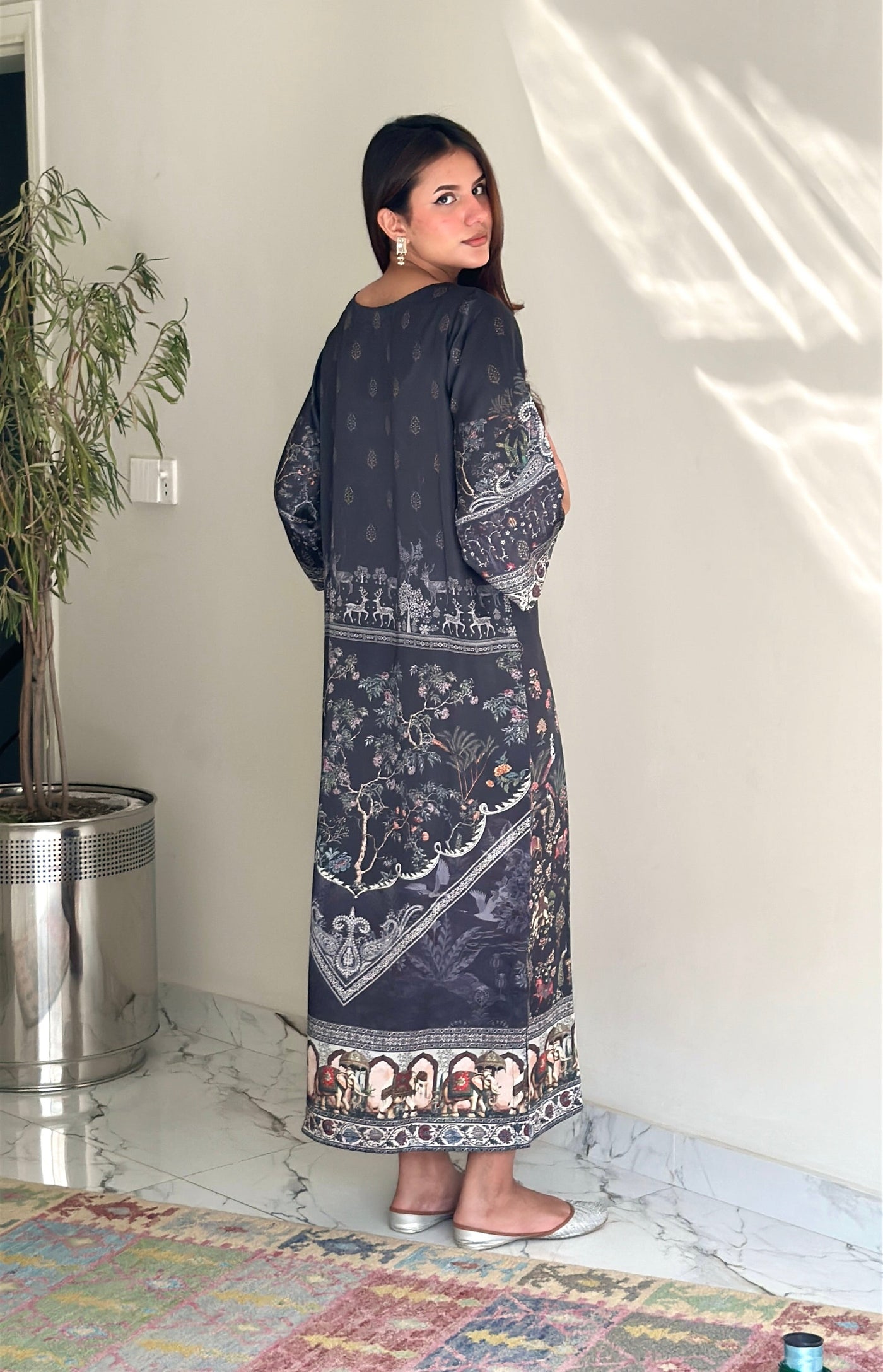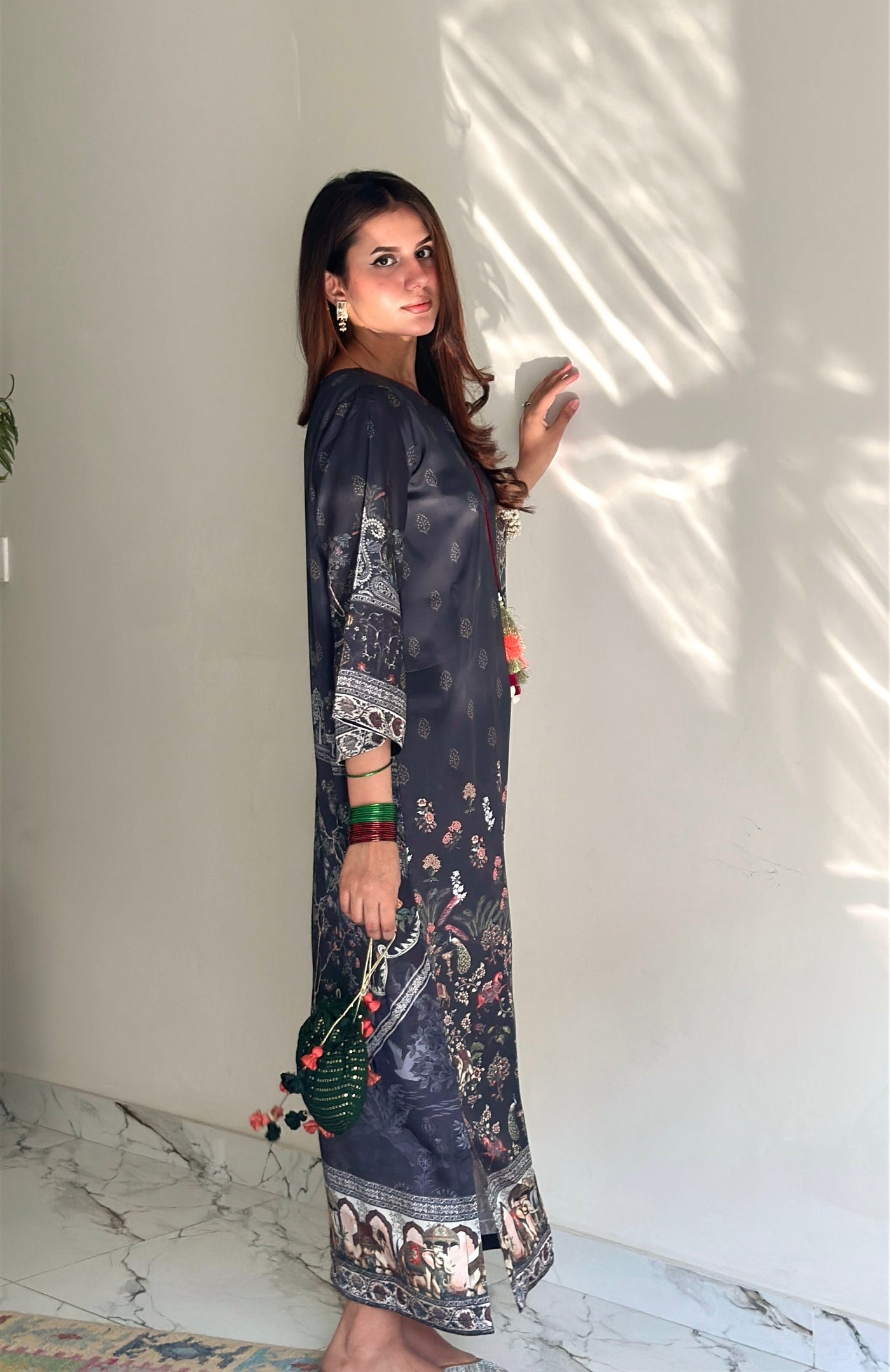 A one-piece long kaftan-style shirt featuring premium silk borders on the hem and sleeves, finished with handmade resham tassels on the neckline for a graceful festive touch.