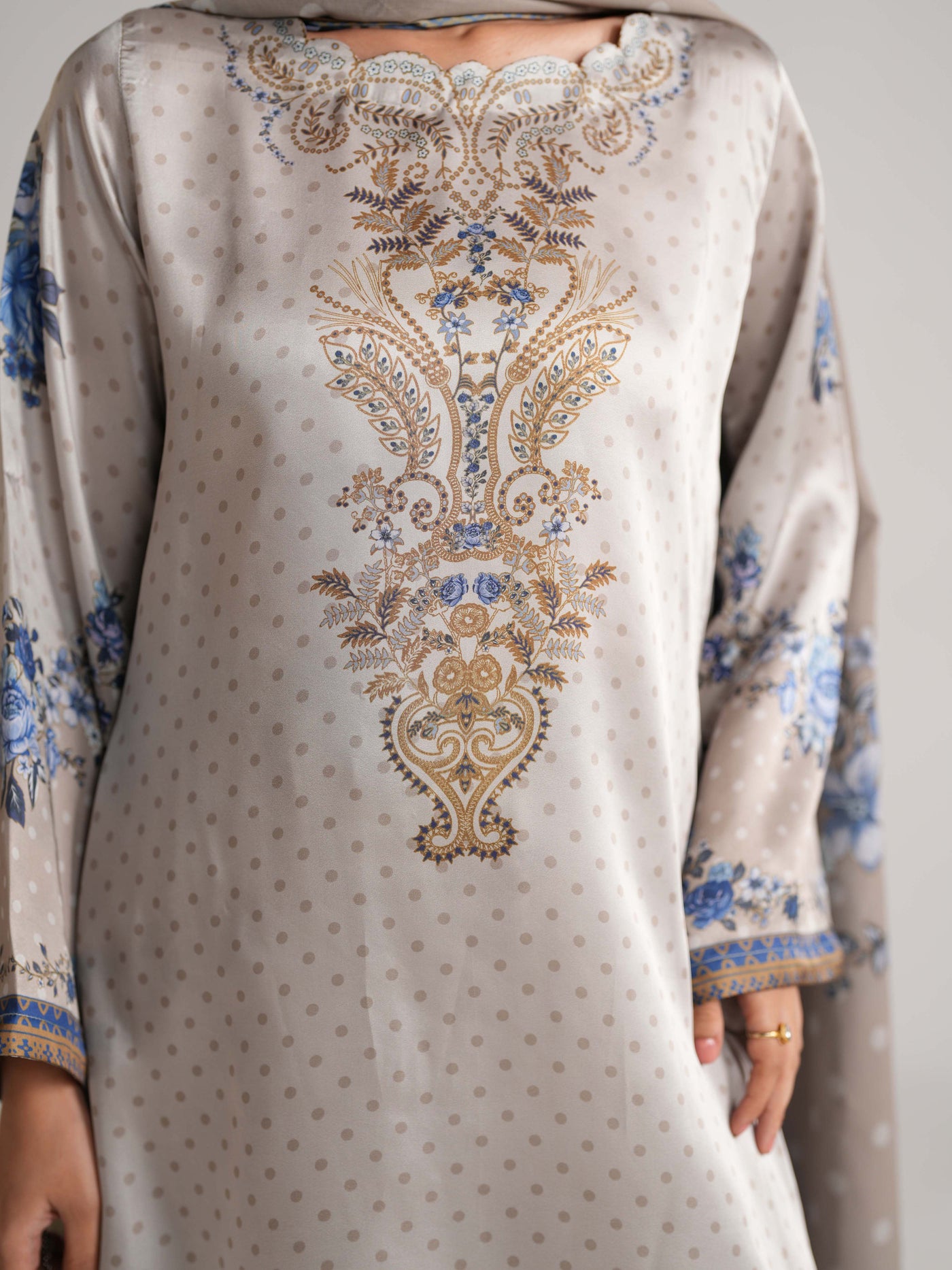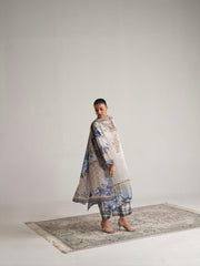 scalloped neckline and premium silk borders on the hem and culottes. Paired with a printed chiffon dupatta for elegant feels.
