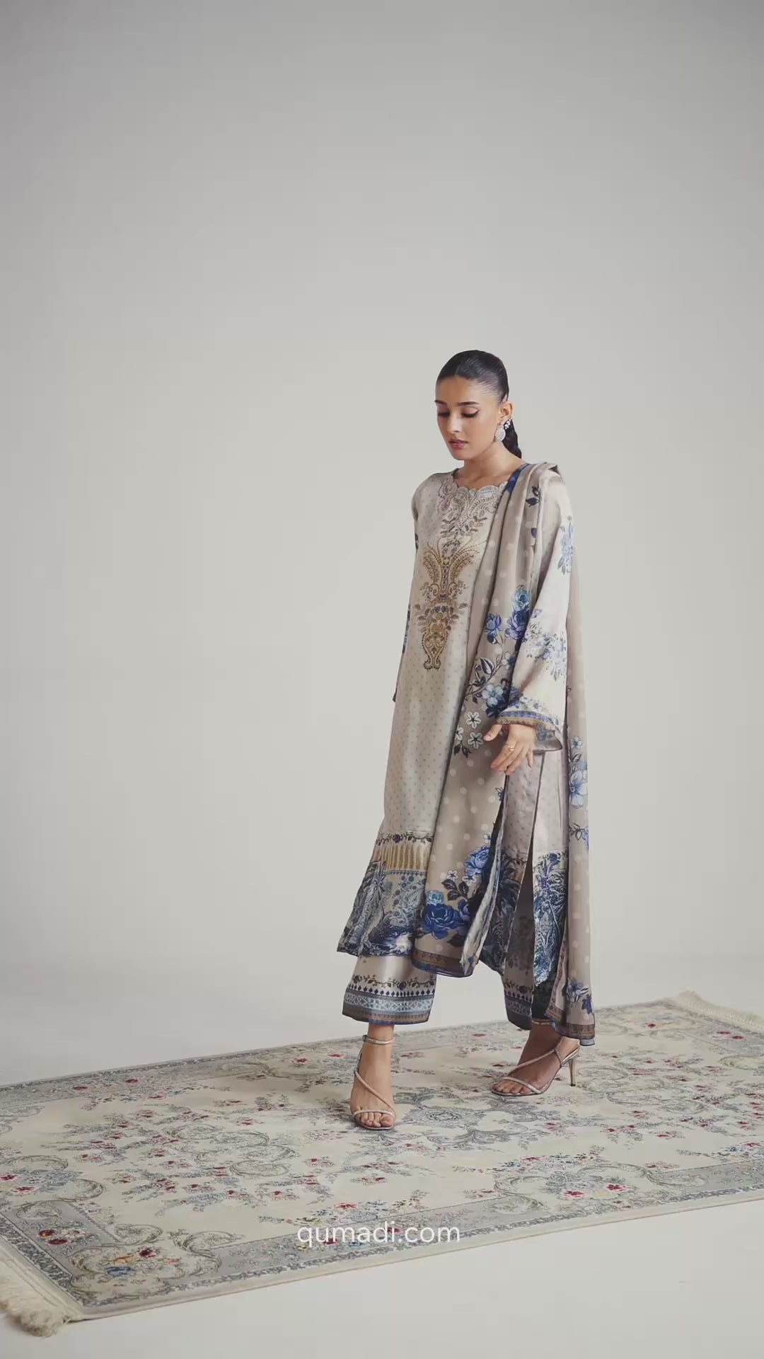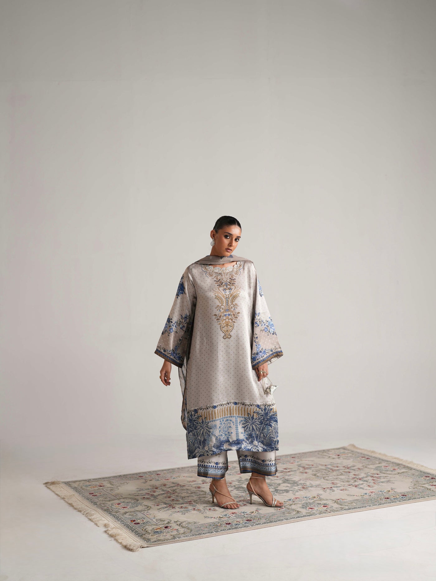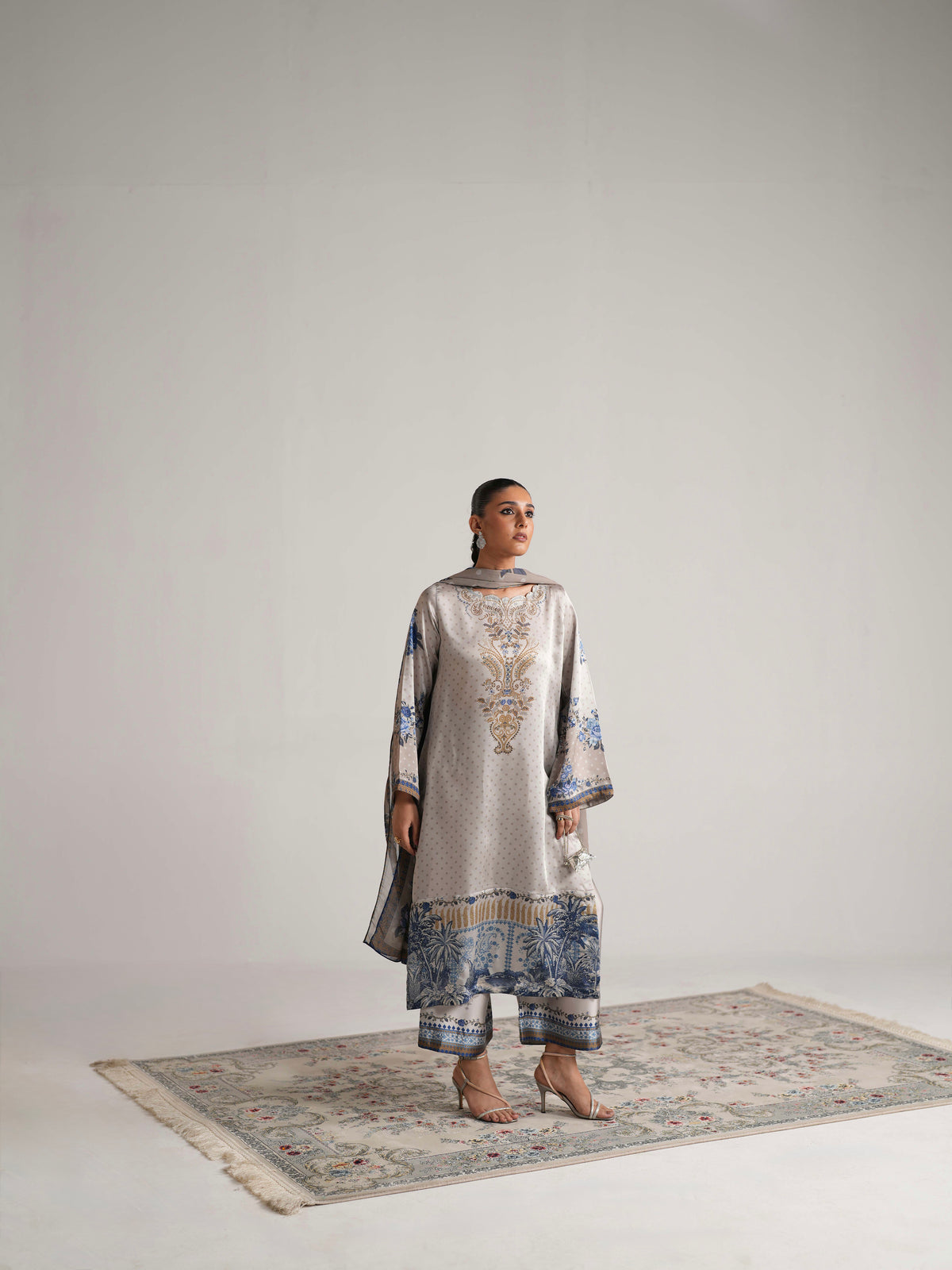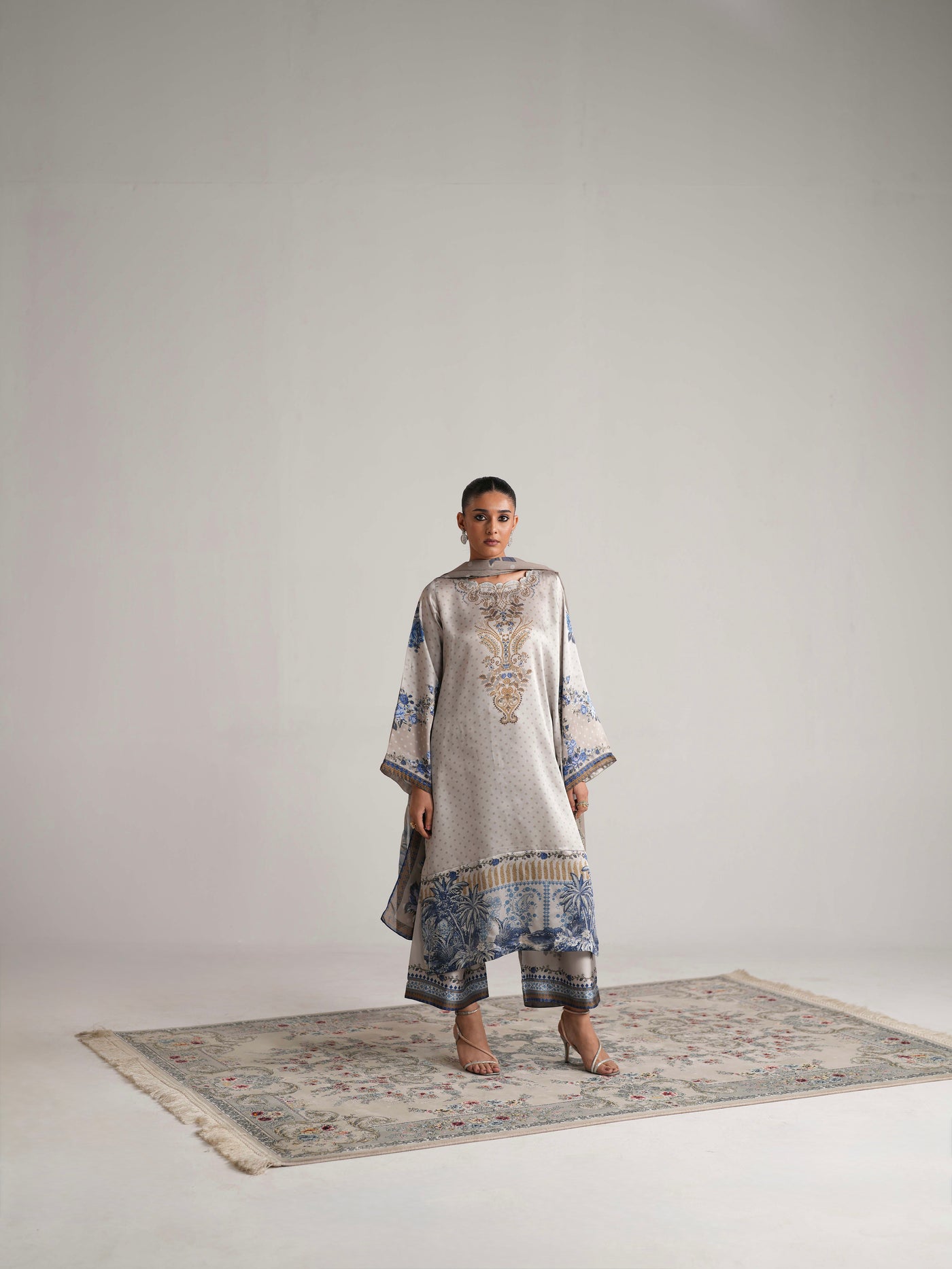 A three-piece set featuring a long kameez and culottes in premium silk, designed with a