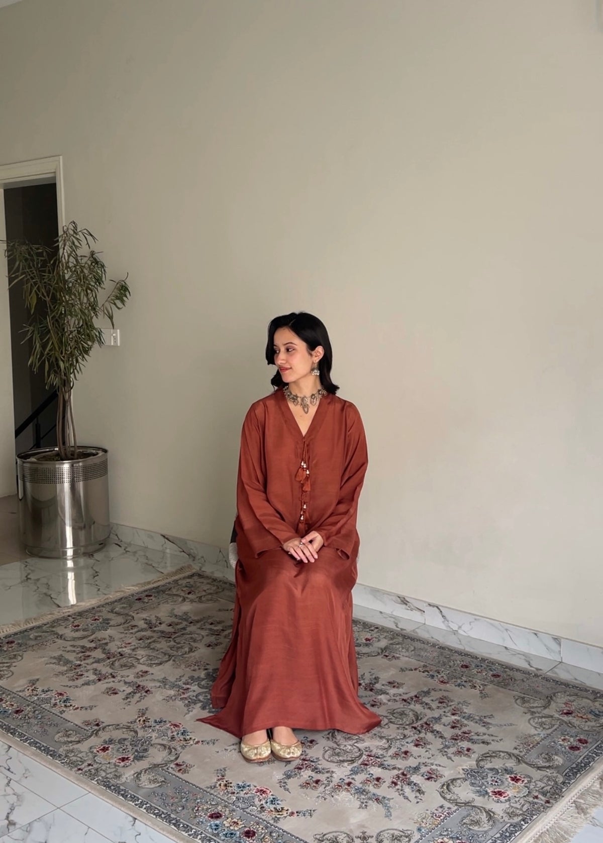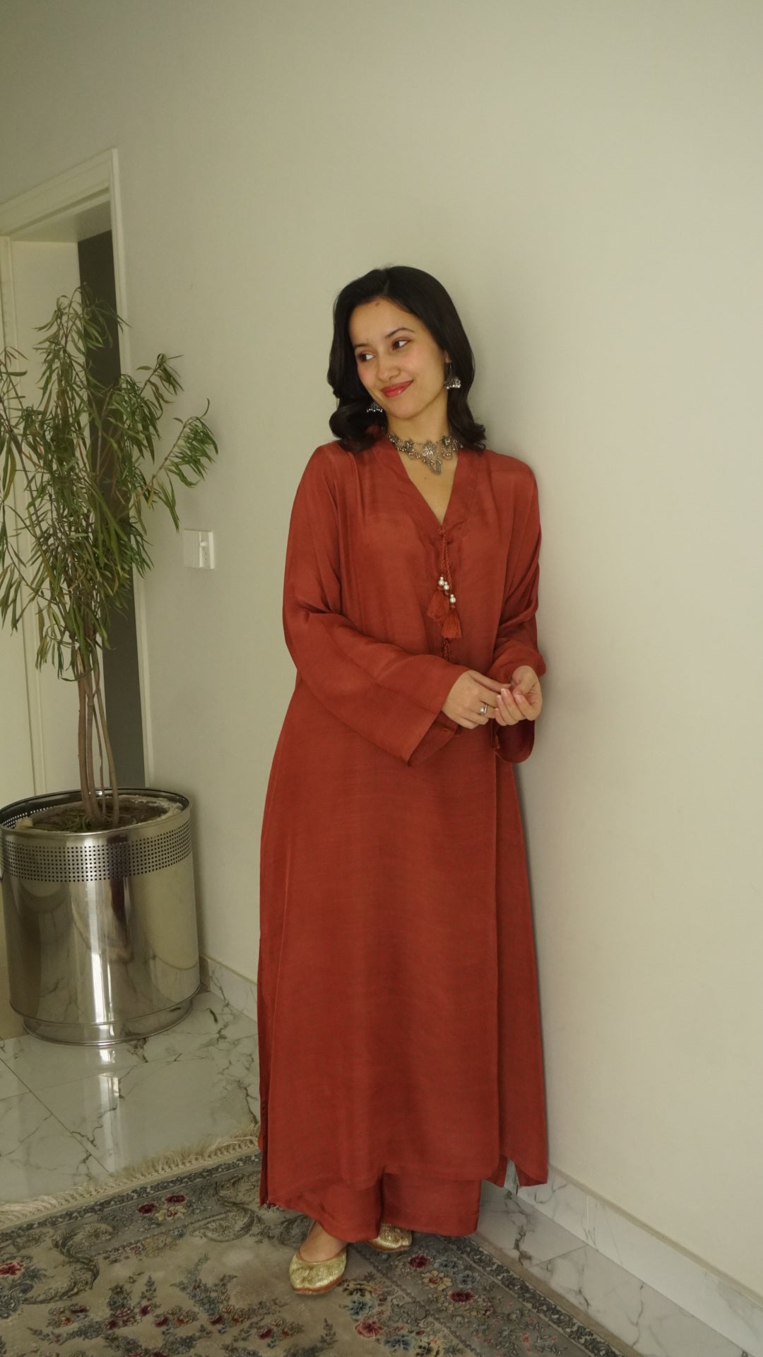 A sleek A-line kameez with subtle tassel detailing on the neckline. Paired with loose-fit wide pants for an effortlessly elegant look.